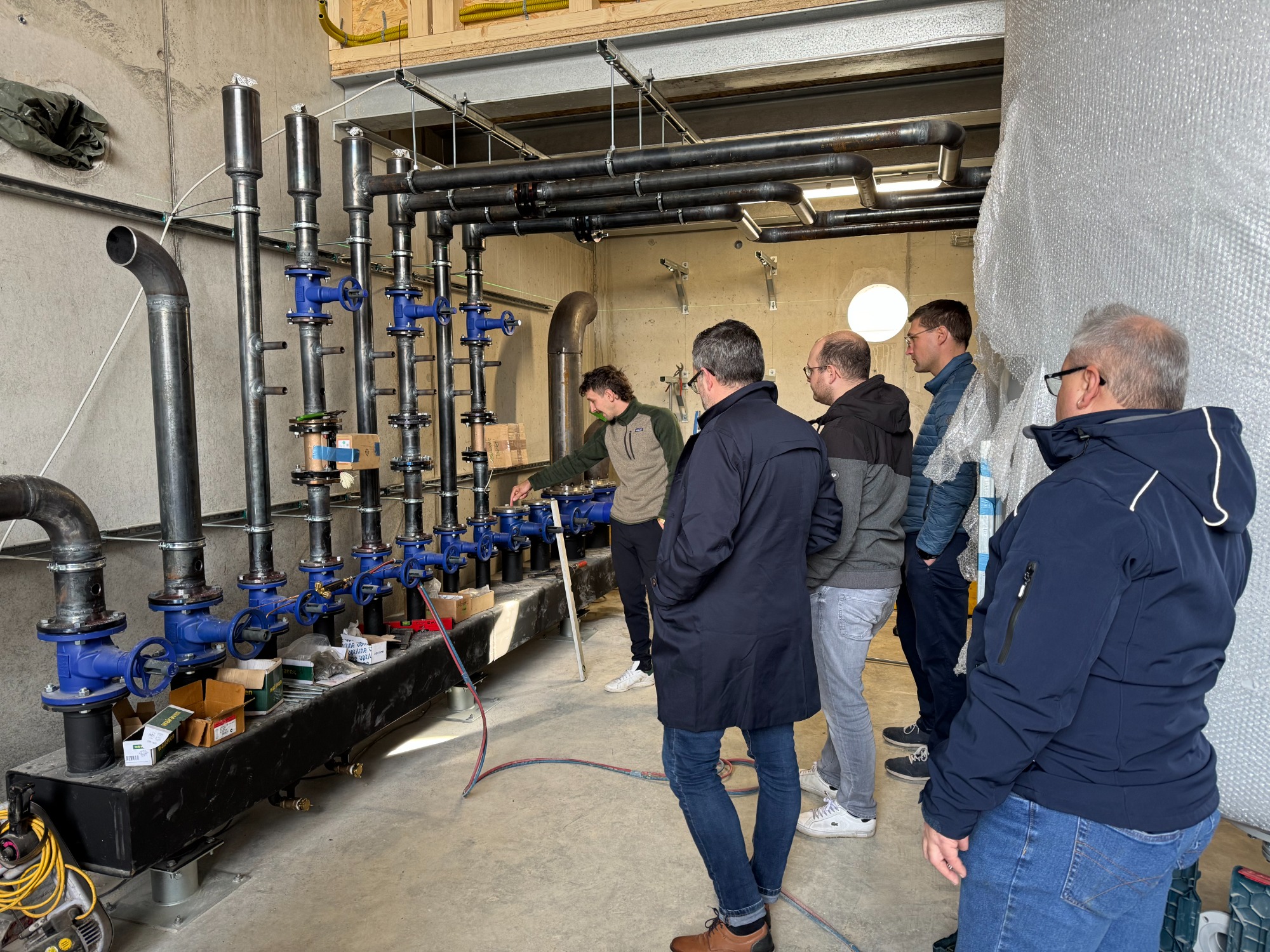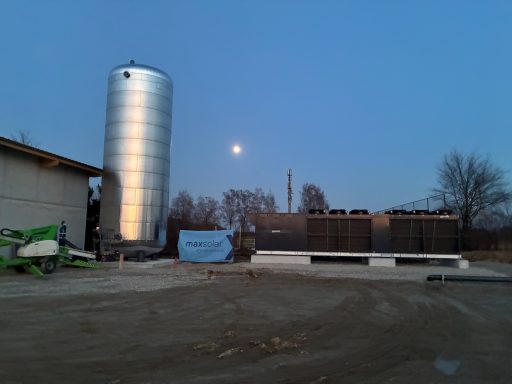In den vergangenen Wochen hat sich vor Ort einiges getan: So wurden unter anderem ein Pufferspeicher mit 102 Kubikmetern Fassungsvermögen sowie eine 600 kW Großwärmepumpe angeliefert und installiert. Die Wärmegewinnung erfolgt künftig über die Kombination aus Wärmepumpe und einer 330 kW Hackschnitzelheizung. Damit setzt das Projekt auf ein nachhaltiges, regionales und zukunftsfähiges Versorgungskonzept.